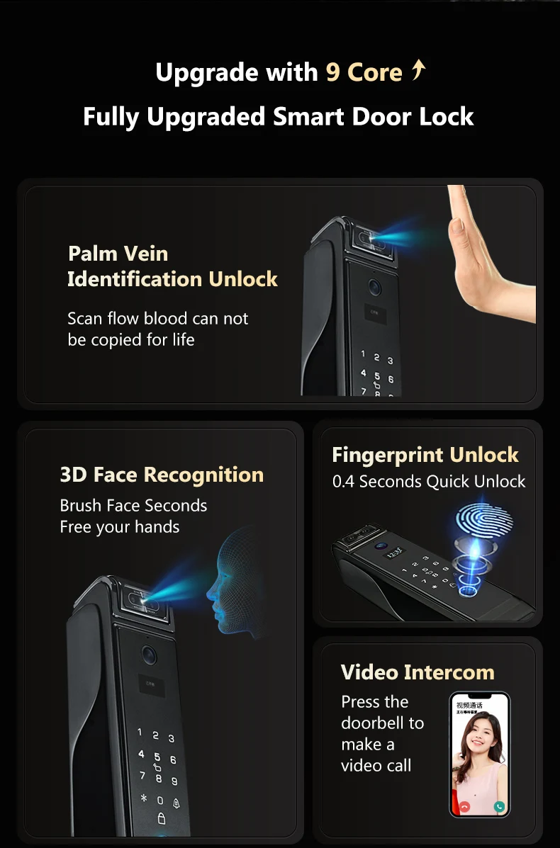 1.6 ways to unlock: 3D Face, Palm Unlock,APP, Fingerprint Unlock, Pass Code, Card, Mechanical Key Unlock;